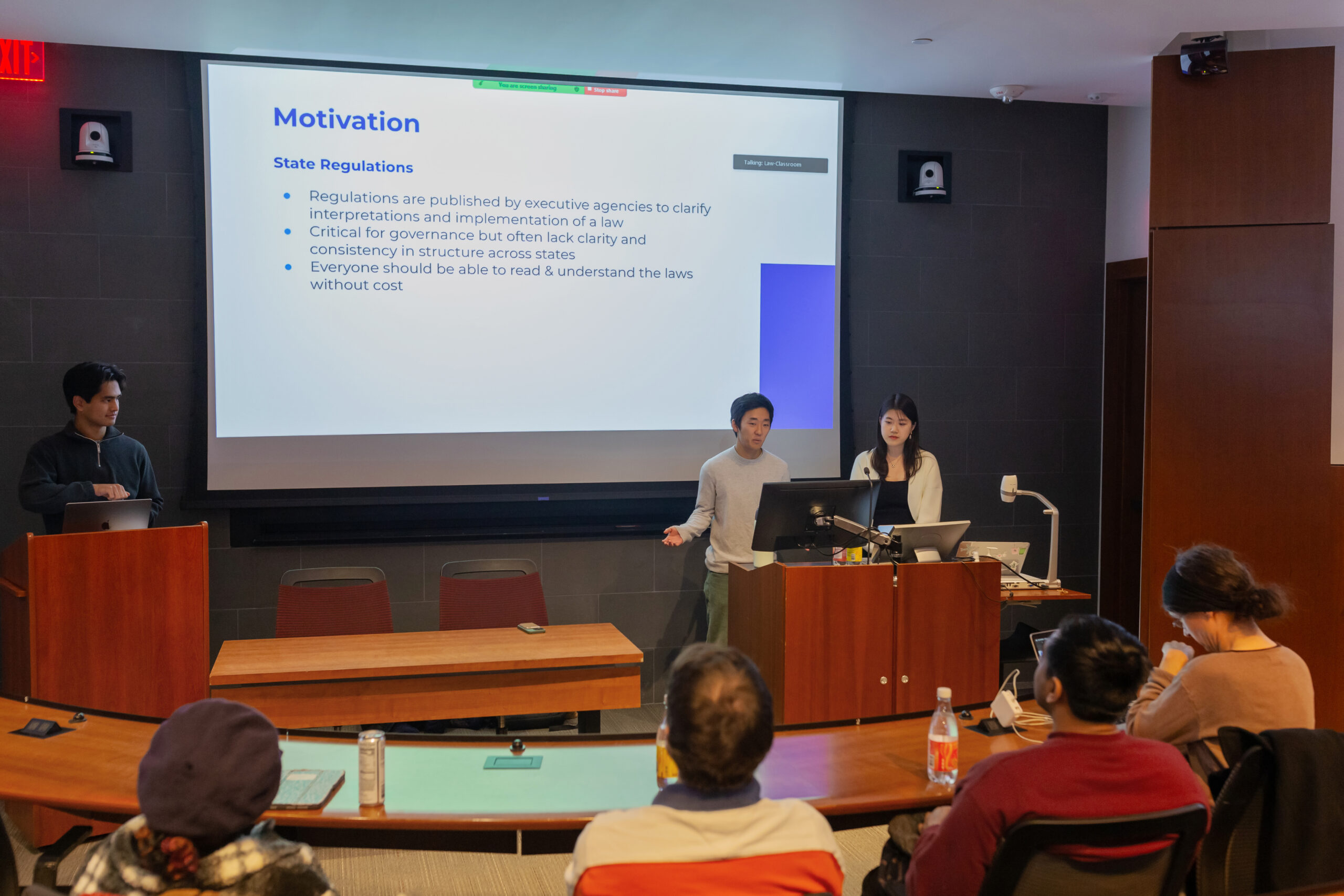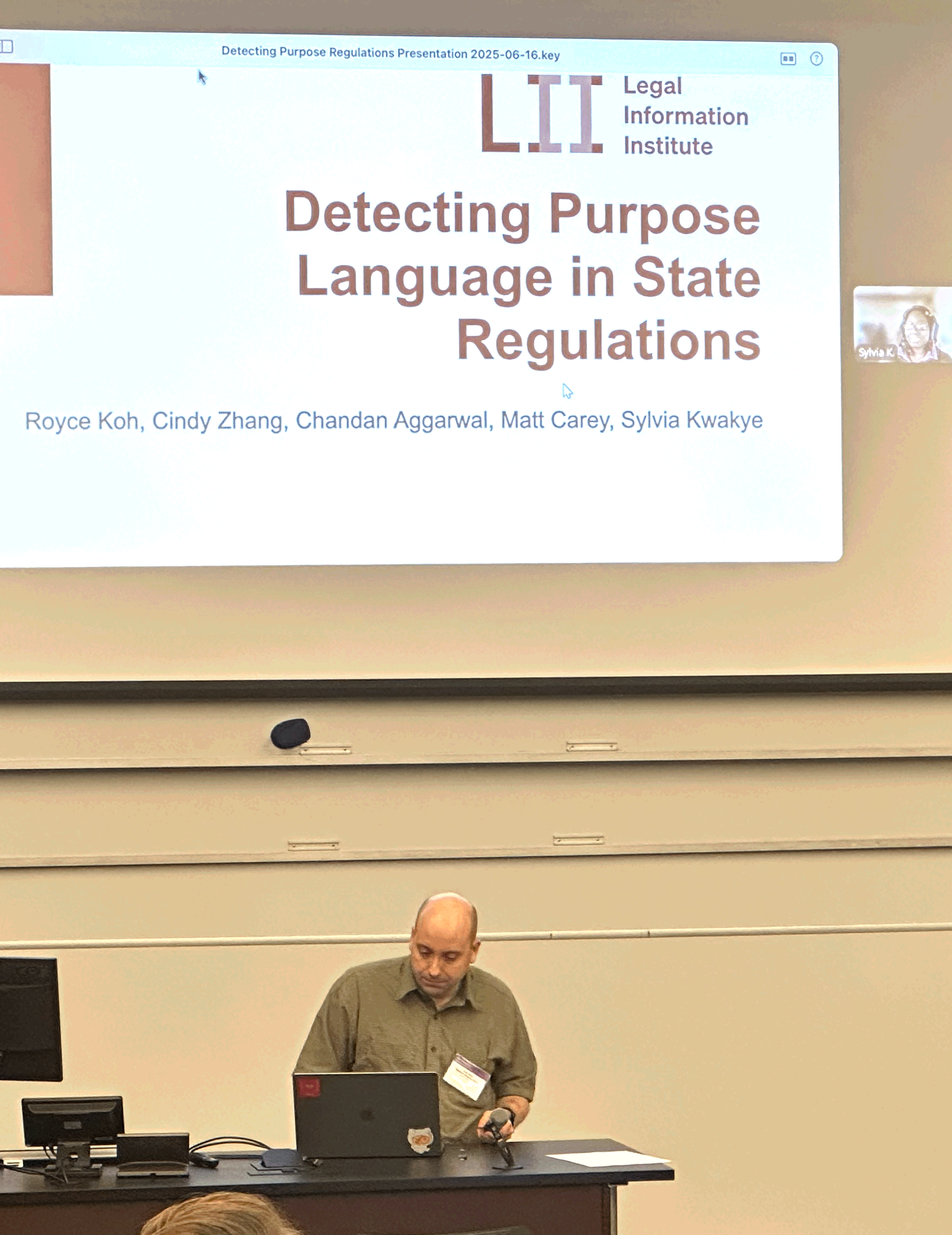 As during the many years since she worked with us while a student, LII’s Language & Data Scientist Dr. Sylvia Kwakye once again oversaw the work of Masters of Engineering (M.Eng.) students in both semesters. With an assist from developer Matt Carey, JD in the fall semester, the project focused on regulatory drafting, identifying the “purpose” sections in state regulations and extracting information from them to characterize, categorize, and compare regulations across multiple states. In the spring semester, M.Eng. student Allen Wang designed and presented a proof-of-concept AI-powered vector search to improve the relevance of results returned to users of our website.